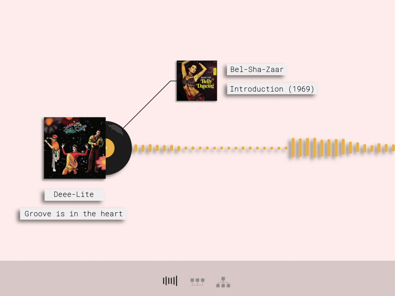 Within the project "data visualization" I made a concept animation with a group of students for an app that visualizes music samples in music. The data in the app is based on the WhoSampled database. In the app you will see three ways to visualize the world of music samples. In the first visualization you will see a soundwave that changes color when a sample is used, the second shows a full timeline that shows the location and quantity of the samples. In the last visualization you see a kind of family tree that shows a network of songs that sample each other.